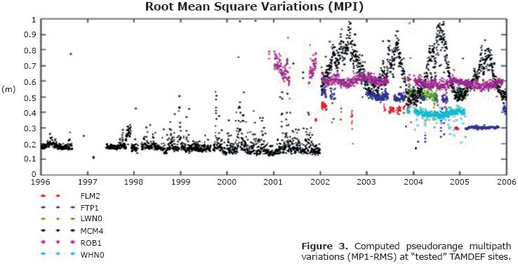 Since the multipath effect depends on the satellite geometry and the surrounding environment of the GPS antenna (as well as the antenna type), it is practically the same after one sidereal day under similar atmospheric conditions. In other words, with the current GPS orbit design, the entire satellite configuration normally advances about 4 minutes between two consecutive days. Thus, the positioning solution of data derived from the repetition of the GPS satellite constellation between two sidereal days ought to be affected by "systematic" multipath. This effect can be used to extract the multipath signature from the positioning time-series (Ge et al., 2000, Roberts et al., 2002). Hilla and Cline (2002) pointed out that the significance of analyzing pseudorange multipath is that the accuracy of any GPS application relies to a large extent on pseudorange measurements (e.g., differential pseudorange, kinematic and rapid static surveying, and ionospheric monitoring). Therefore, in order to identify the effective level of multipath, the daily MP1-RMS and MP2-RMS variations were estimated and analyzed at each TAMDEF site.