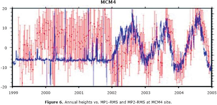 It is very important to point out, that there was no antenna replacement since the installation of the MCM4 site and this is illustrated in Figure 5. Also note that seasonal moisture condensation can be seen inside the radome. Furthermore, for the period between 2002 and 2006 (after the receiver replacement issue), the MP1-RMS and MP2-RMS results for MCM4 behave the same way (i.e., annual variations) getting the highest values in the middle of every year. Prior to 2002, the results look much more comparable among them at MCM4.