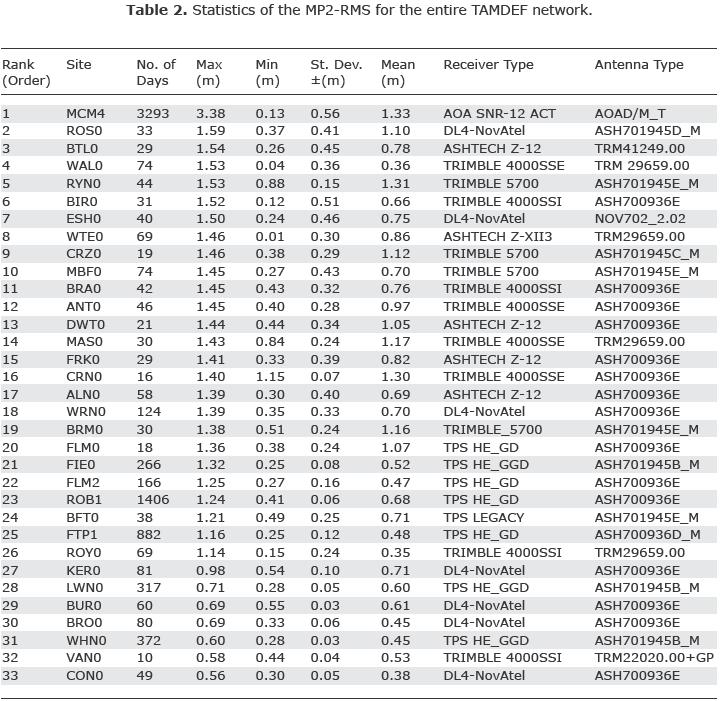 In Tables 1 and 2 are sumarized the IGS designator for the hardware used (i.e., GPS receiver and antenna type) as well as the number of available days of data for each TAMDEF. FTP1, MCM4 and ROB1 were the sites with higher levels (meter range) of pseudorange multipath (MP1-RMS), ranking first, second and third as shown in Table 1. Hypothetically, these three stations are within the most affected tested sites with longer data span, even though they rank twenty first, one and twenty third, respectively for MP2-RMS (see Table 2). It is very important to point out here that, following the recommendation provided by Hilla and Cline (2002) the GPS data used to compute the pseudorange multipath results, which are presented in Tables 1 and 2 were not smoothed. In other words, it was ensure that the TEQC software used to generate the MP1-RMS and MP2-RMS variations had turned off the smoothing option; otherwise results tend to look overly optimistic.