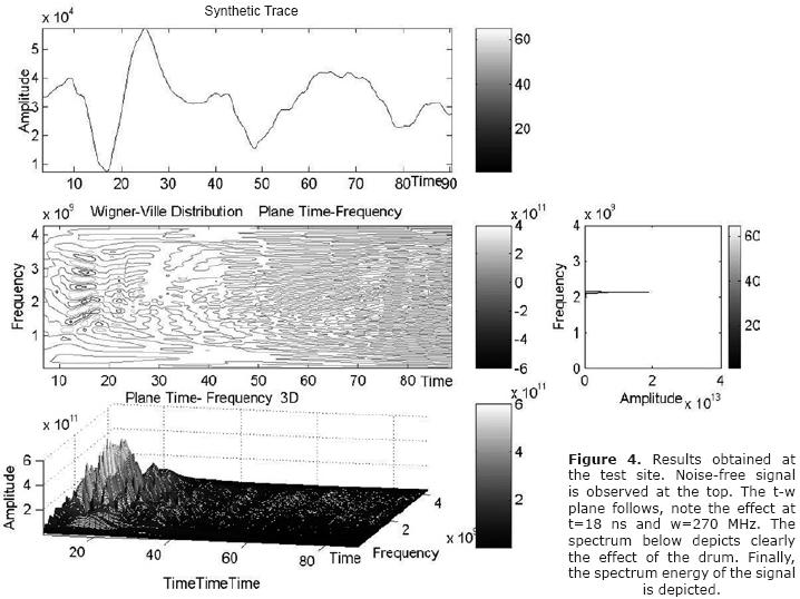 Nonstationary properties of the GPR signal allowed the application of WVD based analysis. A timefrequency representation was obtained, which allowed visualization of the frequency range contributing to the signal in the time scale studied. It allows a better visualization of the position of high amplitude that we can indicate the location of events of interest.