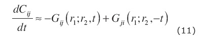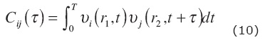 where t is time, υi(r1, t) and υj(r2, t) are simultaneous recordings of microtremors at locations r1 and r2, T is the observation period and Cij is the cross-correlation computed between the two traces as a function of τ, the delay time. Among others, Sabra et al. (2005) have shown that
