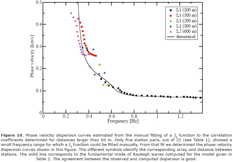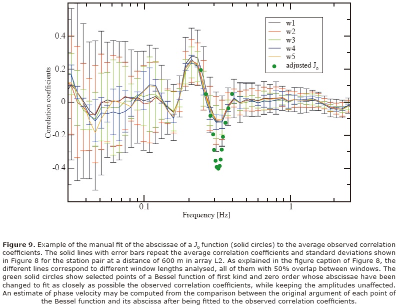 Even if the correlation coefficients from array L1 and L2 were inadequate for an inversion to obtain a phase velocity dispersion curve, for some station pairs, the observed correlation coefficients showed the expected behaviour, i.e., a shape similar to a J0 function, at least for small frequency windows, as shown for 600 m distance in Figure 8. Figure 9 shows the same correlation coefficients computed for the separation distance of 600 m for array L2. In this figure we have superposed a J0 function, manually fitted to the observations by changing the abscissa of each point while keeping the ordinates constant. This modified Bessel function is shown with solid green circles in Figure 9 in the frequency range 0.17 to 0.4 Hz. For each of these points, a phase velocity could be estimated from the comparison between the argument of the original J0 function and the value of the abscissa of that same point after being fitted to the observed correlation coefficients, using the relation between the argument of the Bessel function and the term œr/c. Using this non-standard procedure, we could obtain some estimates of phase velocity for distances of 100, 200, 300, and 500 m for array L1, and for 600 m for array L2, only for five out of the ten distances for which data were recorded in these arrays, and only five out of 22 distances larger than 50 m including measurements for locations A, B, and C.