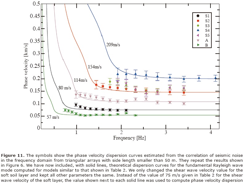 The simple model of Table 2 is also compatible with the phase velocity dispersion estimated from the smaller arrays. Figure 11 shows the estimates of phase velocity dispersion obtained from our small arrays (those shown in Figure 6) together with phase velocity dispersion curves computed for the fundamental mode of Rayleigh waves for models very similar to that in Table 2. The only change made was on the shear wave velocity of the soft layer. All other parameters of the model were kept constant. The shear wave velocity used for the layer is indicated next to each dispersion curve. We observe quite a good fit to the observed dispersion. This fit could be improved, were we to tweak the thickness of the soft layer but we do not think this to be useful at this stage because the model remains not well constrained. Figures 10 and 11 do show, however, that a model similar to that in Table 2 explains our observations and quantifies the lateral variation of the shear wave velocity of the topmost layer.