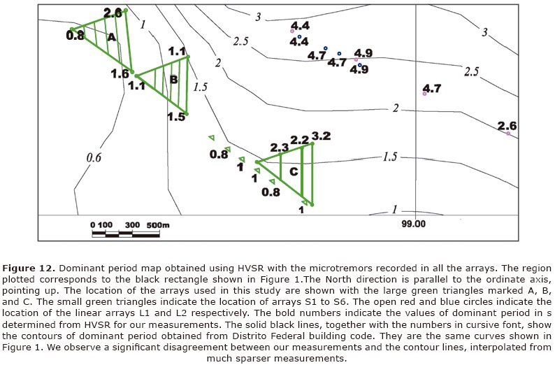 Finally, we computed horizontal to vertical spectral ratios (HVSR) using the microtremor records where three-component ground motion was recorded. We estimated dominant period in the studied region from the large peaks observed in the HVSR. This is not incompatible with the interpretation of the records in terms of Rayleigh waves, as required by the SPAC method. It has been shown that HVSR gives stable results independently of the predominant propagation mode, body or surface waves (Chávez-García, 2009). Figure 12 shows the map distribution of dominant period obtained from our measurements. We observe significant variations, from 0. 8 s on Ignacio Zaragoza avenue up to almost 5 s for the measurements at the stations for the linear arrays L1 and L2. Dominant period varies rapidly over short distances. The dominant period value computed for the model of Table 2 (which does not correspond to a specific site but is mostly based on the results for array L1) is 3 s, in good agreement with the empirical values shown in Figure 12. We have superposed in this figure the dominant period curves shown in Figure 1, included in the Distrito Federal building code.