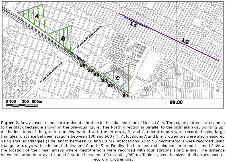 The studied region is located in the lake bed zone in Mexico City, close to the transition zone, along the trace of the Metro-A line (Figure 1). Triangular and linear arrays were deployed mainly along Ignacio Zaragoza avenue (Figure 2). Array aperture spanned a large range, from 10 to 1,960 m. Two different sensor types were used. Vertical sensors HV1 by Kinemetrics (5 s natural period) were used for the arrays smaller than 50 m. For these small arrays, HV1 sensors were installed forming a triangle and all three were cable connected to a single accelerograph. In this case, because the three signals were recorded by the same accelerograph, the sampling for all sensors was simultaneous. For larger triangles, we had to use independent recorders at each measurements point, and therefore had to check a common time base for all the records. We used GPS antennas to synchronize all recorders to GMT. If the accelerograph locks to the time signal received by the GPS antenna, then common time for all the records is guaranteed. There was only one triangle for which one of the accelerographs failed to lock its internal clock to the GPS time signal, and the record had to be discarded. For distances between stations of 60 m and larger, we used triaxial broad band sensors CMG40 by Guralp, able to record faithfully ground velocity down to 0.03 Hz, each one coupled to a different accelerograph. Ground vibration was recorded using K2 and Etna accelerographs by Kinemetrics.