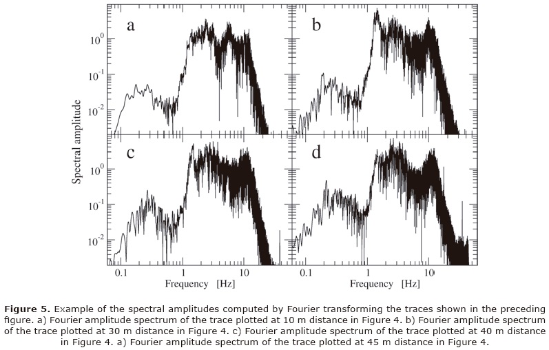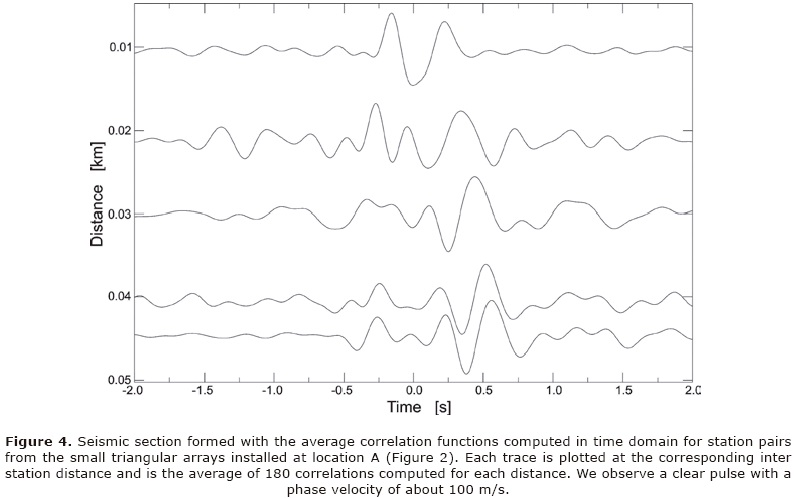 Consider now an example of time domain correlation. Figure 4 shows average time domain correlation for all station pairs for the five triangles with size smaller than 50 m at location A (Figure 2), plotted at the corresponding distance between stations. They correspond then to the correlation coefficients shown in Figure 3. Again, each trace is the average for all possible station pairs at the corresponding distance. The pulse corresponding to the Rayleigh wave mode is clearly observed. The phase velocity of this pulse can be measured in Figure 4, it is about 100 m/s. Figure 5 shows the Fourier amplitude spectra of the four traces shown in Figure 4. The Rayleigh wave pulse apparent in Figure 4 has energy in the frequency band from 1 to 10 Hz, although the largest amplitudes occur between 1 and 4 Hz.