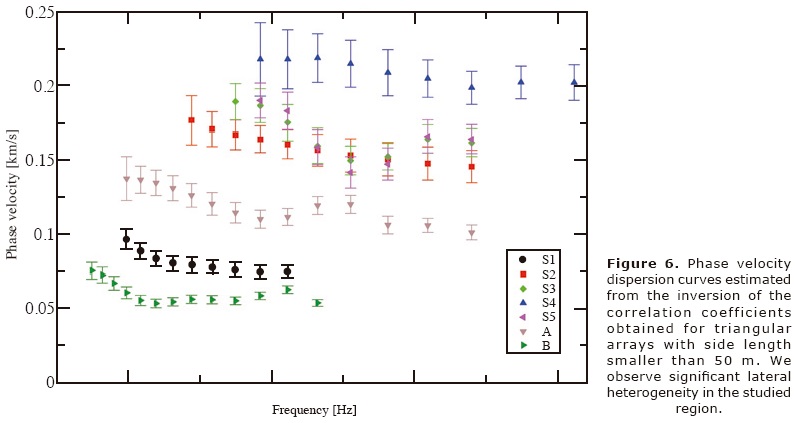 The results for our larger arrays are disappointing. At low frequencies the phase velocity dispersion curve is very steep, indicating a large impedance contrast at the base of the clay layer. That impedance contrast is the reason for the large amplification of seismic ground motion in the lake bed zone, which in a model such as that in Table 2 is equal to the impedance contrast between the layer and its substratum. Our results fail to constrain the shear wave velocity in the half-space. As explained in detail in Chávez-García (2011), if we cannot constrain the shear wave velocity below the soft sediments, we cannot compute the expected amplification. We expected that larger distances between stations would allow us to correlate waves propagating through the substratum. This is not the case.