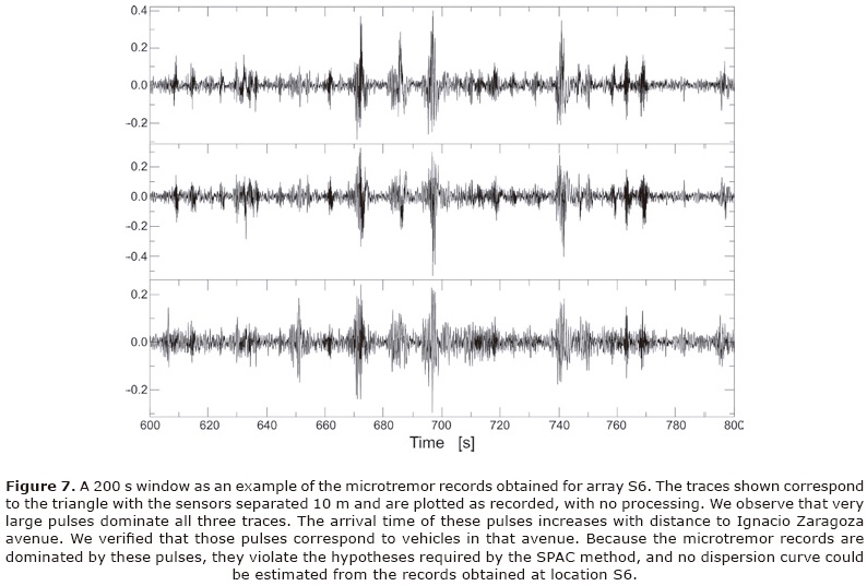 Figure 6 does not show results for measurements at array S6. A 200 s window of raw microtremor data recorded at this array for 10 m distance between stations is shown in Figure 7, as an example of the records at that location. The records in this figure are dominated by very large amplitude transients, common to the three stations. We verified that these transients correspond to trucks and cars going by in the large Zaragoza Avenue; arrival time increases with distance to this avenue. Correlation between the traces is strongly affected by these signals which are certainly not aleatory (we can easily identify the same pulse in the three stations) and originate from a moving point source. The basic hypothesis of the SPAC method, waves propagating with equal power in all directions, is violated and no significant result could be obtained for this array.