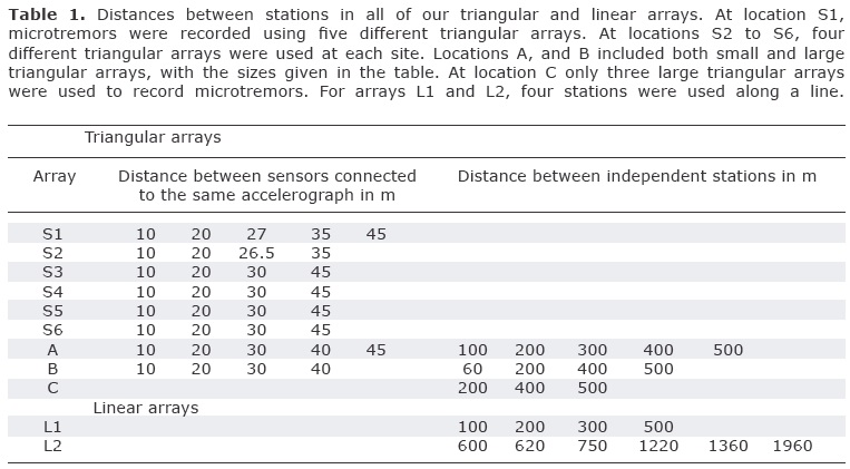 Finally, two additional linear arrays (L1 and L2) were deployed using four stations for each one. Their location is shown with the blue and red lines in Figure 2. The distance between stations is given in Table 1. Array L1, solid blue line in Figure 2, had separation between stations varying between 100 and 500 m. Array L2, solid red line in Figure 2, had separation between stations going from 600 to 1,960 m. The two linear arrays recorded microtremors for one hour.