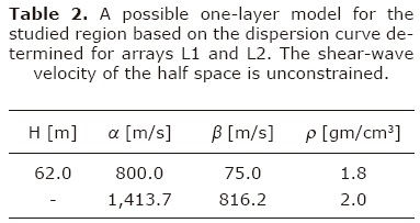 The phase velocity dispersion curves we estimated are consistent between our small and large arrays. However, although a significant velocity contrast below is clearly indentified, the results are unable to constrain the velocity of the deeper medium. Moreover, because the phase velocity estimates shown in Figure 10 were obtained using a manual fit of the Bessel function, they are less reliable than the phase velocities shown in Figure 6, obtained using a formal inversion scheme based on eq. (9). For these reasons, we have not tried to estimate a 1D layered model from the inversion of the phase velocity dispersion curves. Rather, we propose the model shown in Table 2, based on the phase velocity dispersion estimated in Figure 10. A single layer over a half space model is the simplest model that can fit the observed dispersion. This proposed model constrained the velocity of the soft layer to 75 m/s, to fit the Rayleigh phase velocity observed at frequencies larger than 1 Hz in Figure 10. The shear wave velocity of the half space must be larger than 500 m/s but is otherwise unconstrained. We took density values adequate for the soil layer and half space from Pérez-Cruz (1988). We computed phase velocity dispersion for the fundamental Rayleigh wave mode for the model in Table 2, varying the thickness of the layer until a reasonable fit was obtained. The computed dispersion curve is shown with a solid black line in Figure 10. Even if the model of Table 2 is not well constrained, the agreement between observed and computed phase velocity dispersion is quite good.