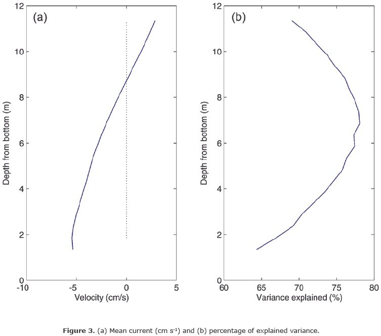The mean current (Z0) and the vertical profile of the percentage of explained variance are shown in Figure 3. On the average, in the upper layer an input flow is established while in the lower layer there is an output flow. The thickness of the lower layer is greater than the thickness of the upper layer. The explained variance reaches its highest value at the middle of the water column. The hypothesis is that the combined effect on the tidal currents by bottom stress and surface stress in conjunction with stratification generates the observed patterns, where stratification is related to a gravitational flow induced by evaporation in the inner basins.