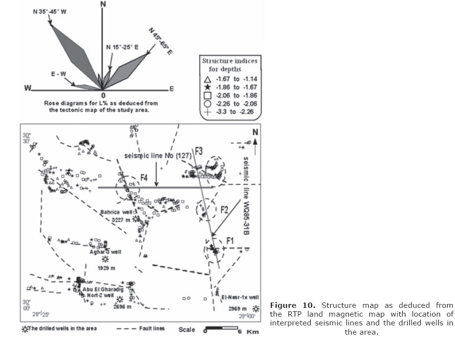 Por otra parte WQ85 dos líneas sísmicas-31B y 127 fueron interpretados y la localization de estas líneas son coincidentes con el mapa tectónico deducido. Los resultados muestran que existe una gran coincidencia entre la ubicación de las fallas deducidas de los datos geomagnéticos y sísmicos. Los resultados obtenidos indican una buena relacion con los datos de pozos. Además, estas estructuras están relacionadas con las actividades del terremoto registrado por el National Egyptian Seismological Network (ENSN). La correlación permite deducir que la zona de estudio es más estable que otras áreas adyacentes en el norte de Egipto, cerca del mar Mediterráneo y el río Nilo Delta.
