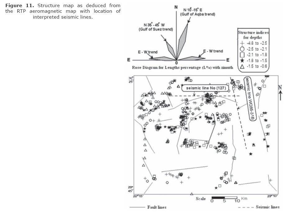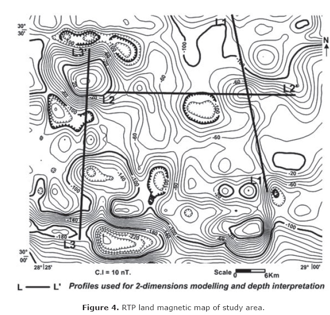 El mapa de RTP aeromagnéticos fue usado para detectar la extensión regional de las estructuras de interpretación a partir del trabajo de prospección magnética. Las interpretaciones fueron realizadas en mapas RTP del terreno y aeromagnéticos utilizando, técnica de filtrado, separaciones del mínimos cuadrados, análisis de tendencias tectónicas, análisis espectral, el método de Werner, y Euler y dos técnicas de dimensiones. Los resultados muestran que las principales tendencias tectónicas dominantes son N35° - 45°W, N45°- 65° E, E -W y las tendencias de Aqaba.