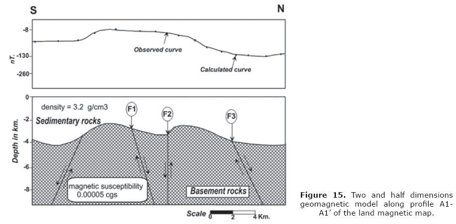 The results show that the profile A1- A1' is affected by four faults from south to north (Figure 15). Whereas profile A2-A2' shows that it is affected by one fault F4 (Figure 16). In general the configuration of the basement surface obtained from 2.5-D modelling technique illustrates that the main depth of the area increases towards the north and west directions. The main depths to the basement surface range between 3.5 and 4.5 km.