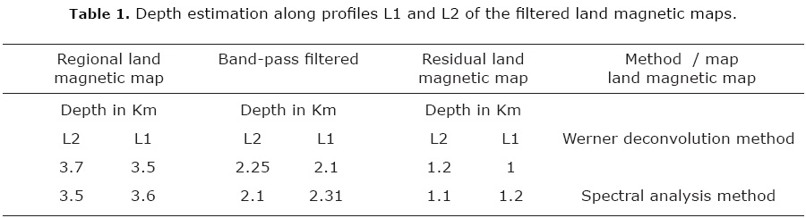 Depth estimation methods were applied to the filtered land magnetic maps to determine the mean depth of these structures. In case of Werner deconvolution method the mean values along the basement interface were calculted. Table 1 summarizes the results of Werner deconvolution and spectral analysis methods that would be explained later.