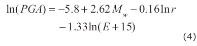 Where in this relation, PGA is maximum peak ground acceleration in Gals observed in the horizontal component, Mw is the moment magnitude, 'r' is the hypocentral distance and E is the epicentral distance in km. Root mean square error between logarithm observed and estimated PGA obtained from this relation is 0.87 and standard deviation in the PGA is 0.42, which is less than that observed in GMPE given in eq. (3).