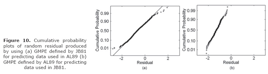 The test on normality and model inadequacies on various GMPE shows that GMPE behave almost similar to its dataset which was initially used for its prediction. In order to check the effect of normality for predicting data set other than that used for developing the respective GMPE a test is performed to predict data set of AL89 using GMPE given by JB81 and that of JB81 using GMPE given by AL89. Clear deviation from normality is observed in this test which is shown in Figure 10. These cumulative probability plots show that the mean is a negative value which means there is a problem of underestimation. The problem of underestimation can also be due to the difference in the variables used in two GMPE models. It is seen that the deviation from cumulative probability plot on predicting the data of AL89 by JB81 is less because of the large amount of data used by AL89 as compared to JB81.