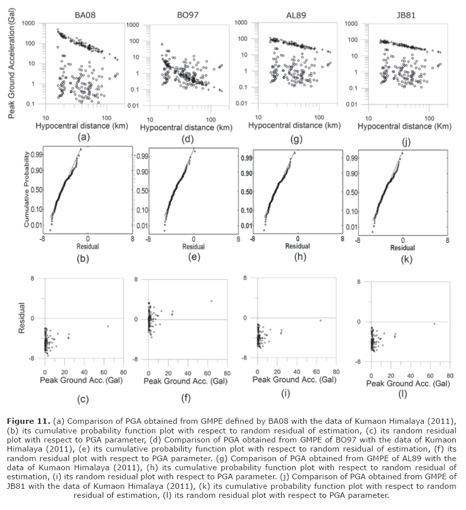 The effect on the assumption of normality and model inadequacies in the GMPE used for predicting regional Himalayan data is checked in this paper. In this test GMPE of AL89, JB81 are included because of its frequent use in strong motion modeling of Himalayan earthquakes (Joshi, 2006; Kumar et al., 1998) and in seismic hazard estimation of the region (Bhatia et al., 1999). This test also includes other recent GMPE given by Boore et al. (1997) and Boore and Atkinson (2008). The GMPE given by Boore and Atkinson (2008) and Boore et al. (1997) is now hereby referred to in the text as BA08 and BO97, respectively. The test checks the distribution of random residual with respect to PGA and deviation of its random residuals from normality and is shown in Figure 11. It is seen that the ground motion relations by AL89, BA08 and JB81 overestimate the value of PGA when applied for predicting Himalaya data, thus clearly emphasizing the need to develop a new GMPE for the region. Although BO97 gives comparable match in terms of predicted parameter, strict deviation from normality is clearly seen in the GMPE when used for predicting Himalayan data. It is seen from this test that when these relations are used for predicting values of PGA for Kumaon Himalaya, a fat tail or heavy tail is clearly seen in the normality of random residual which clearly indicates deviation of GMPE from normality. This type of deviation from normality is expected to affect PSHA technique where we use 10% of probability of exceedence of PGA in 50 years as a major parameter for seismic hazard zonation.