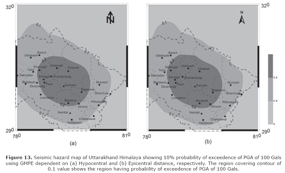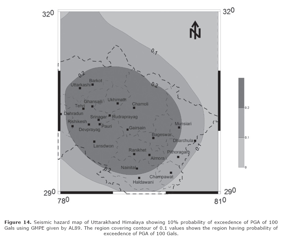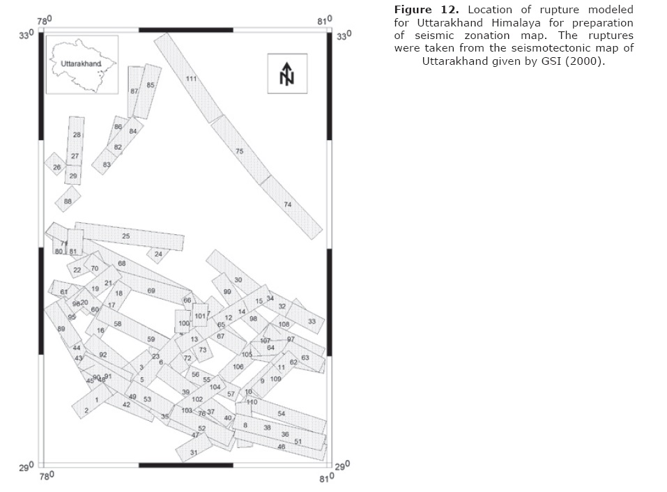 It is seen that appropriate choice of GMPE influence the value of predicted parameter. In an attempt to check how GMPE can influence seismic hazard map of the region, the seismic hazard map of Uttarakhand Himalaya is prepared using different GMPE. Joshi and Patel (1997) have formulated a method of seismic zonation which is based on the deterministic modeling of finite ruptures along identified probable fault in an area using a semi empirical approach. This method of zonation has been applied for the Doon valley (Joshi and Patel, 1997); Assam valley (Joshi et al., 2007) and the Uttarakhand Himalaya (Joshi and Mohan, 2010). The technique of zonation is dependent on the semi empirical simulation technique which in turn is dependent on the GMPE applicable for the region under study. In the preparation of seismic zonation maps for the Uttarakhand Himalaya by Joshi and Mohan (2010), Joshi and Patel (1997) the GMPE relation given as AL89 has been used. Although AL89 is based on worldwide data it is seen in the present work that this relation suffers from problem of overestimation and deviation from normality when used for predicting Himalayan earthquakes. In the present work seismic hazard for PGA of 100 Gals for 10% probability of exceedence is prepared using modified seismic zonation technique given by Joshi and Patel (1997). Various steps in this technique are as follows: