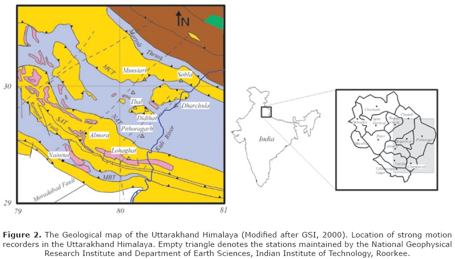 A network of eight stations has been installed in the Pithoragarh region of Kumaon Himalaya under a major seismicity project sponsored by the Department of Science and Technology, India. Accelerographs have been installed in an area of 11,812 sq. km in the Pithoragarh and adjoining region. This network had recorded several events in this region since March, 2006. The hypocentral parameters of events recorded at three or more than three stations have been determined using HYPO71 software originally developed by Lee and Lahr (1972). Those events which are recorded at one and two stations are also used in the present work after calculating hypocentral distance from S-P time in the record. Location of these eight stations along with the geology of the region is shown in Figure 2. Three-component force balance accelerometer has been installed at each station. The threshold level of instrument was set at a very low threshold of 0.005% of full scale in order to have nearly continuous digital recording mode. The sensitivity of instrument is 1.25V/g and full scale measurement is 2.5V. This means the instrument has very low threshold of 0.1 gal. The purpose of such a low threshold level is to record almost every possible local events in small span of time i.e., March 2006 to March 2008. Sampling interval of digital data is kept at 0.01 sec. The minimum inter station distance between these stations is approximately 11 km. The records collected from the accelerograph have been processed using the procedure suggested by Boore and Bommer (2005). The processing steps involve baseline correction, instrumental scaling and frequency filtering.