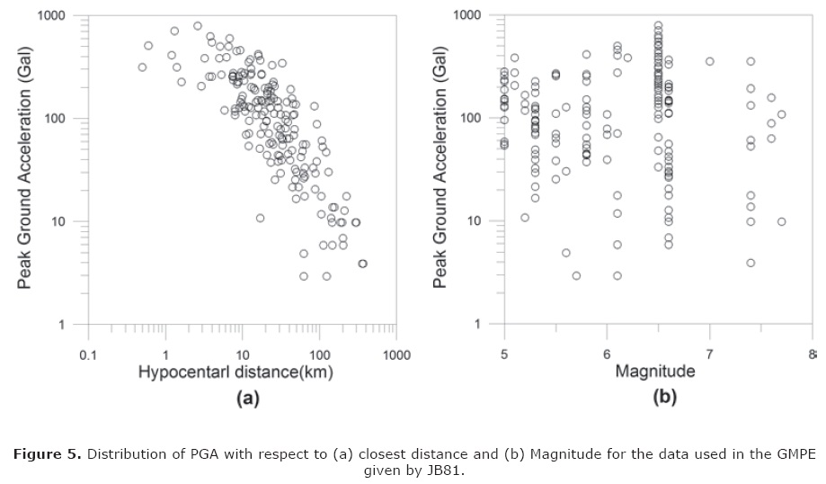 The GMPE developed by Joyner and Boore (1981) has been used for preparing the seismic hazard map of India and adjoining region by Bhatia et al. (1999) under Global Seismic Hazard Assessment Program (GSHAP). The GMPE given by Joyner and Boore (1981) is hereby referred as JB81in the text and is given as: