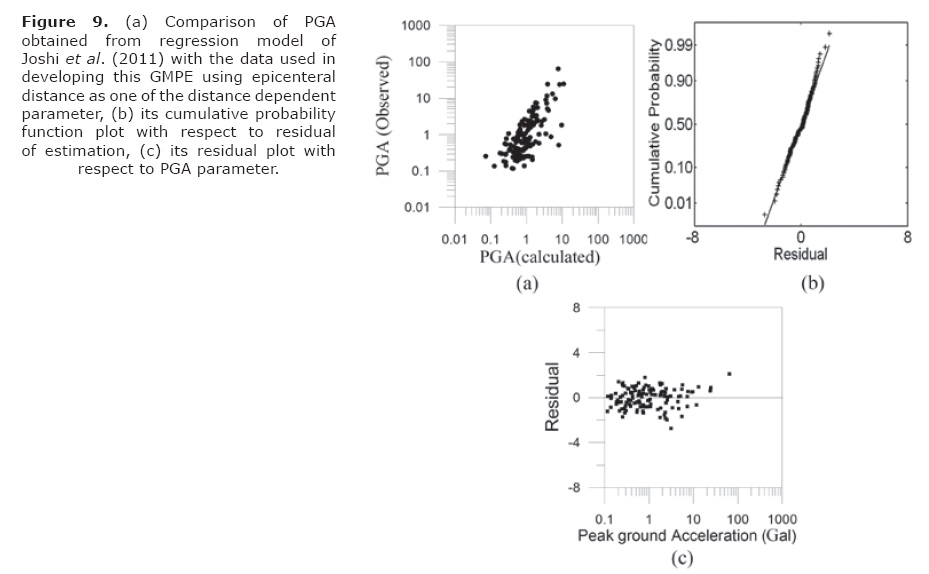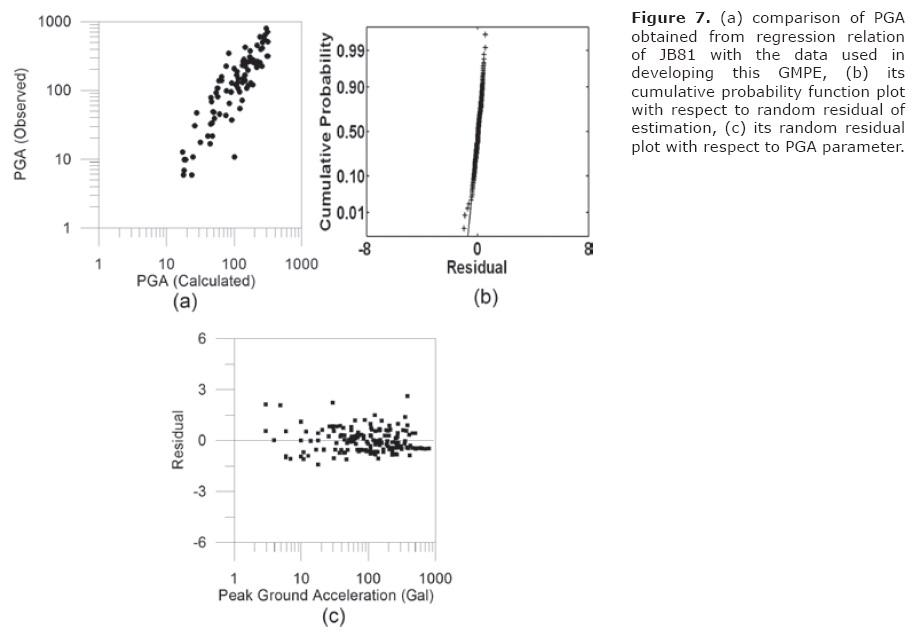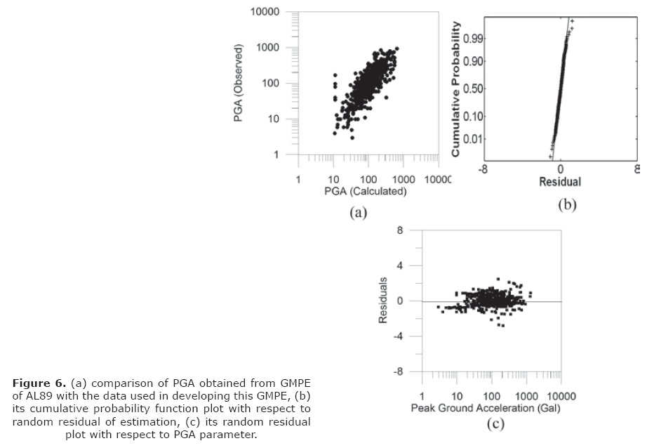 A very simple method for checking the normality assumption in GMPE is to construct a cumulative probability plot of the residuals. First step in this process is calculation of random residuals. The random residual is defined as difference of logarithm of actual and predicted values. The random residuals are arranged in an increasing order and are plotted against cumulative probability in order to make cumulative probability plot. The ideal normal probability plot of random residual follows a straight line. Substantial departures from a straight line indicate that the distribution is not normal. A departure from normality is potentially serious as the t or F statistics and confidence and prediction interval depends on normality assumption (Montgomery et al., 2001). The model inadequacies in the GMPE are checked by the plot of random residual versus actual value. In the present work model adequacies present in various GMPE are checked by plotting random residuals versus observed PGA values with random residual on vertical axis. It is seen that as long as the plot of random residuals versus observed values follows horizontal band there are no model inadequacies. Strong deviations of random residuals from this band and strange patterns often resulted due to the model inadequacies (Montgomery et al., 2003). The GMPE given by AL89 has been tested for normality and model inadequacies in the present work. The observed and predicted value of PGA is shown in Figure 6(a). The check of normality and model inadequacies is shown in Figure 6(b) and 6(c), respectively. The relation between predicted value of the PGA used in the dataset and the actual value obtained from this relation is shown in Figure 6(a). The linear trends of plot in Figure 6(a) denote that GMPE is capable of predicting the data which has been used for its generation. The plot of random residual versus cumulative probability in Figure 6(b) shows presence of weak tail in the cumulative probability plot. The horizontal band of residual in all range of actual data defend that the model is adequate to predict PGA values. The GMPE given by JB81 is tested in the present work. First look between estimated and observed parameters in Figure 7(a) shows a linear trend which gives an impression that the relation can predict PGA parameter; however a closer look on the plot of cumulative probability function versus random residual in Figure 7(b) shows presence of tail in one end of this relation. Funnel pattern in the plot of random residual versus predicted parameter in Figure 7(c) shows that variance increases as Y decreases and this can be attributed from less number of data point in high magnitude range.