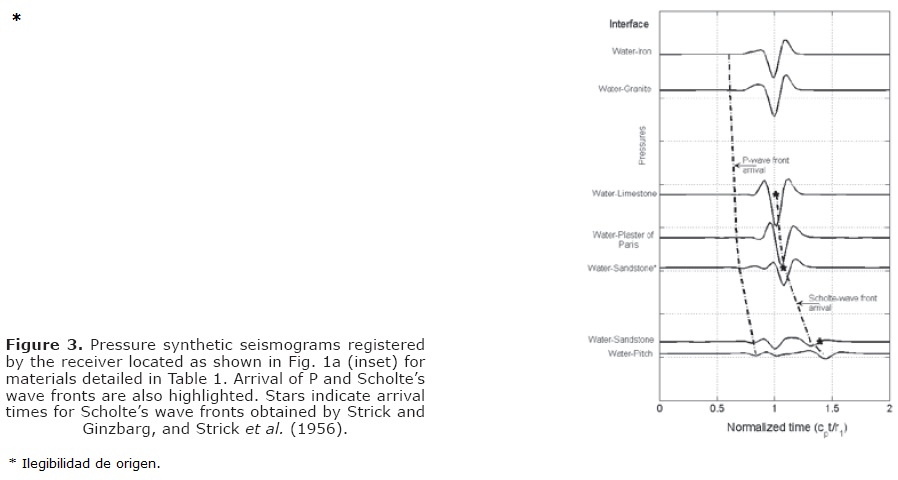 In the seismogram of pressures, the last wave front corresponds to the Scholte's waves, which clearly carry the most of interface energy, as expected. The same effect can be seen in the case of displacement seismograms. It is relevant to note that for the x3 direction displacement amplitudes are larger than those for the x1 direction. This can also be seen in Figures 2a and b (middle and bottom).