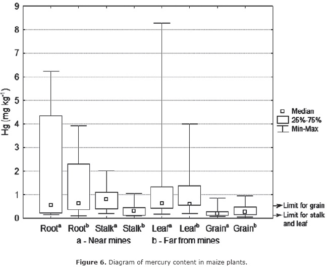 The concentrations of total mercury in the different structures of the maize plants are showed in Table 3. The structures (root, stalk and leaves) close o the mines presented a higher concentration of total mercury than those which are located farther from them, while there was no difference in the maize grain (Figure 6). The maximum concentrations in leaves (8.2 mg Kg-1) and in the grains (0.9 mg Kg-1) resulted higher than those reported by He et al. (1998); being in leaf 1.58 mg kg-1 and in grain 0.41 mg kg-1. The total mercury concentrations found in maize plants (0.04-8.2 mg kg-1) were greater than those found by Qiu et al. (2006) in the mining area of northeast Guizhou, China (0.026-0.57 mg kg-1). In general, there was a greater total mercury accumulation in roots and leaves than in stems and grains.