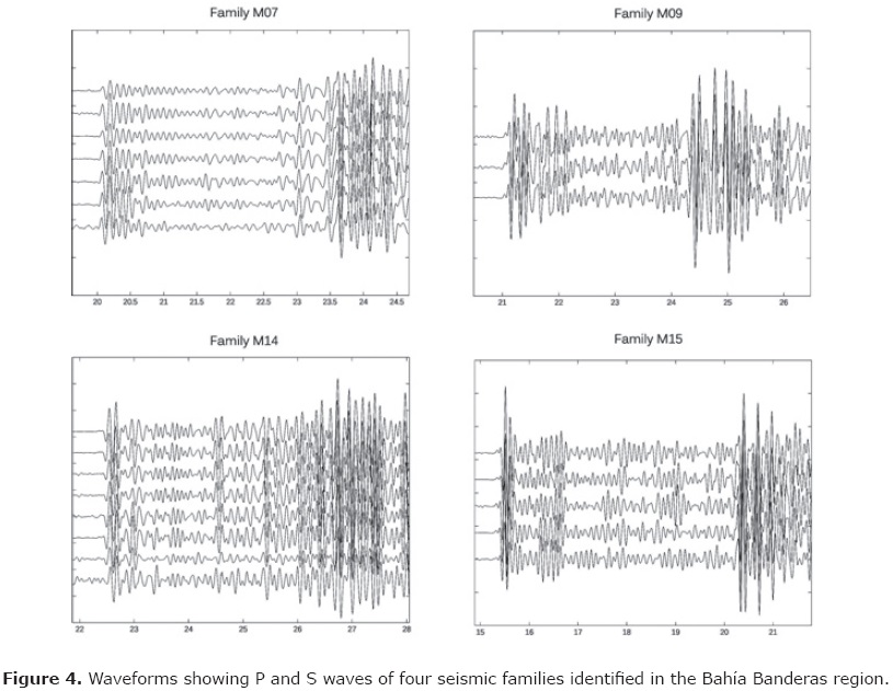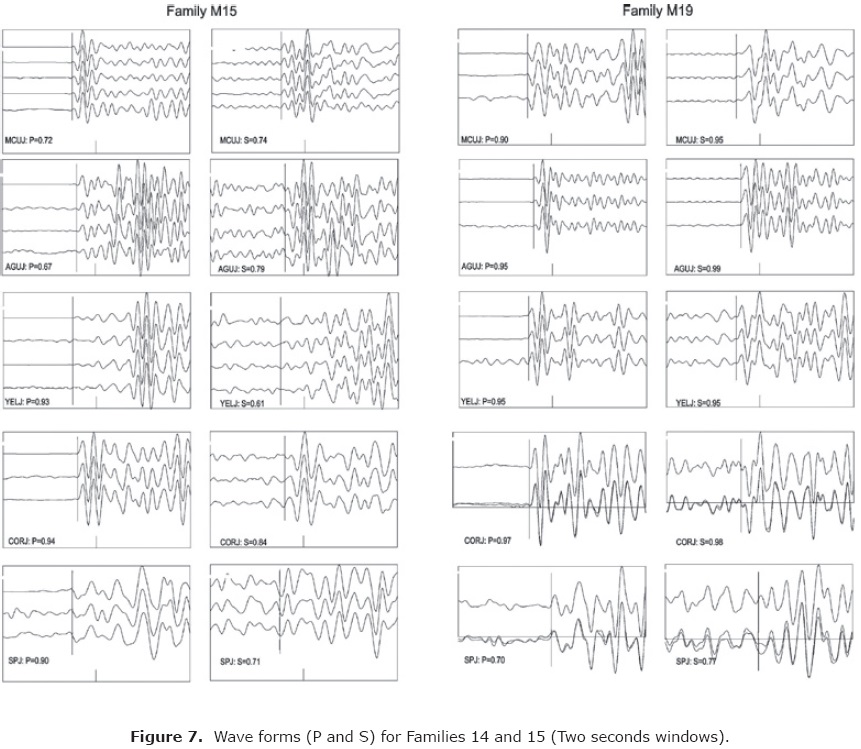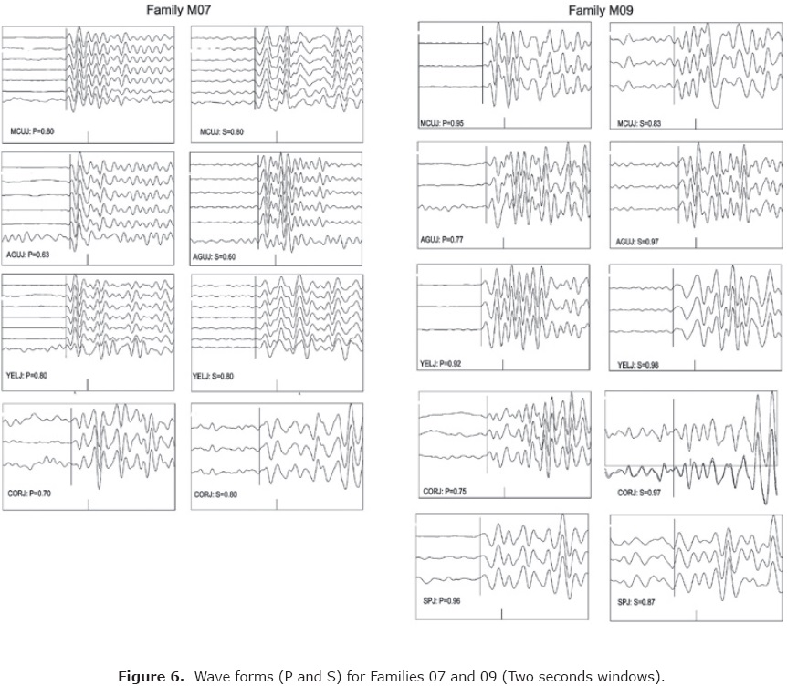 Three of the 17 families (A16, M08, and M16) were discarded from the analysis because we cannot adjust the arrival times in the waveforms. In Figures 6 and 7 we show the waveforms of four well-defined families (M07, M09, M14 and M15). Here the correlation program adjusted the arrival times for each earthquake in the families. We also show the correlation values obtained for each station.