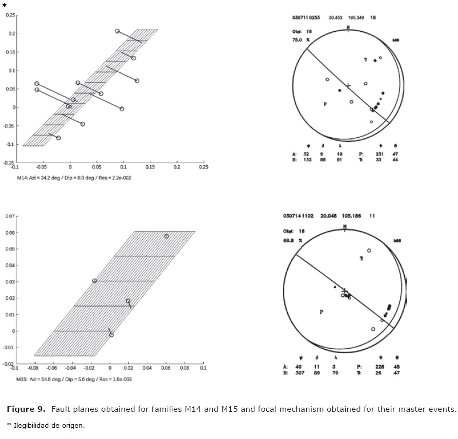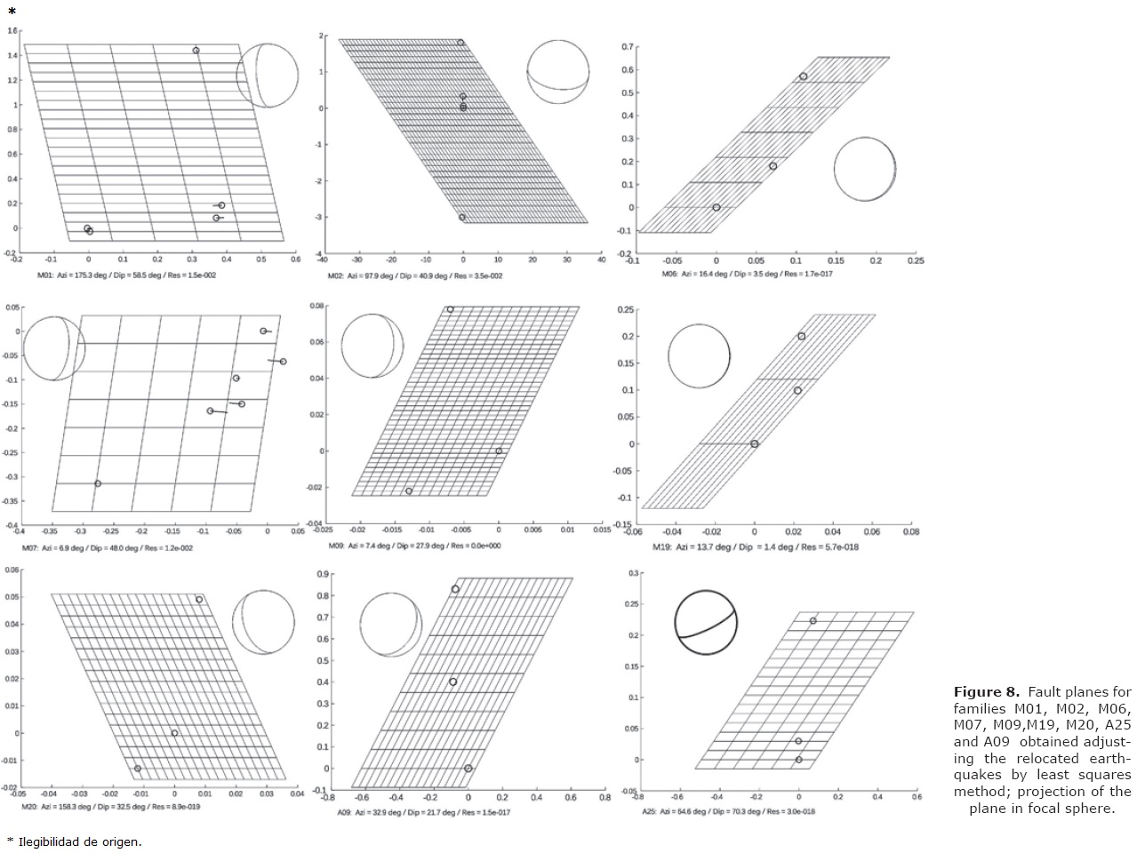 With the correlation between master event and its family result we used a linear method (Console and DiGiovambattista, 1987) to find relocated hypocenters of earthquakes relative to the master event. The hypocenter coordinates and the associated errors are given in Table 1. Based in this cluster of dots, we can estimate plausible fault planes near the master event with a least squares method. Only 11 families yielded reliable fault planes. The relocation results, alignments and possible fault planes for families M01, M02, M06, M07, M09, M19, M20, A09 and A25 are shown in Figure 8. For master events of Families M14 and M15 we had an adequate number of polarity data to obtain focal mechanisms; the solutions of these focal mechanisms agree with the fault planes obtained with the least squares method (Figure 9).