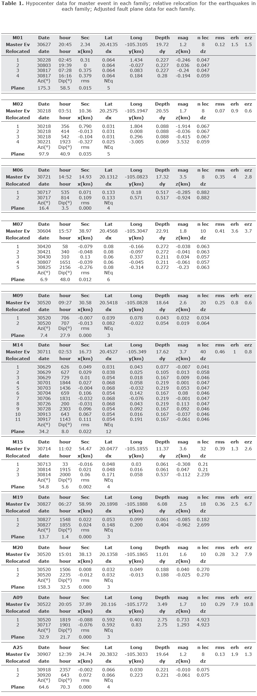 From the available data and the analysis of cross-correlation, we define 17 families of events, which could be associated with sources mechanisms and stationary paths in an area south of BahÃa de Banderas. For 14 families we obtain a relative relocation using a master event technique. The largest earthquake recorded at as many stations as possible was chosen as the master event in each family. Relocation of earthquakes in each family reduced the spatial scatter of epicenters to areas with radii less than 1 km. These 14 families have foci within the continental crust, at depths of 10-22 km, except for families M19 and A09 which are located within the upper 10 km of the crust. Using a least squares approach, we could model fault planes for 11 of the families. Focal mechanisms were determined for two of the master events (M14 and M15) and in both cases they were consistent with modeled planes, which support our results.