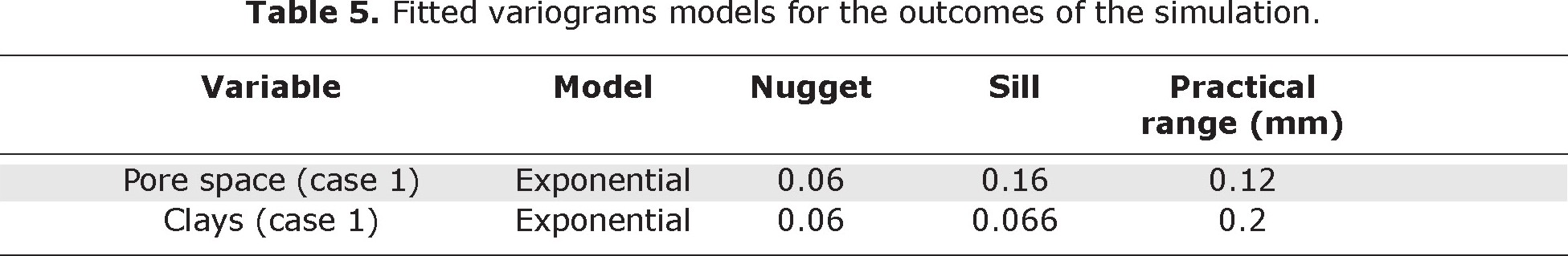 Figure 8, Figure 9 and Figure 10 show variograms for pore space (case 1 and case 2) and clays. To every variogram obtained a model was adjusted, the collection of which are presented in Table 3.