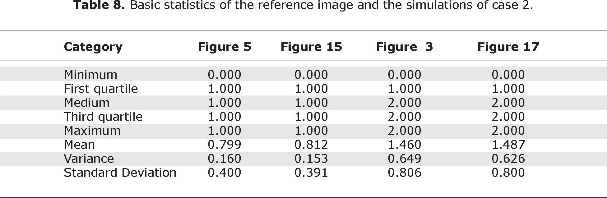 The result of the second stage (Figure 13) is compared with the reference image (Figure 3). Table 4 (columns 4 and 5) and Table 6 show the proportions and basic statistics of the reference image and the simulation.