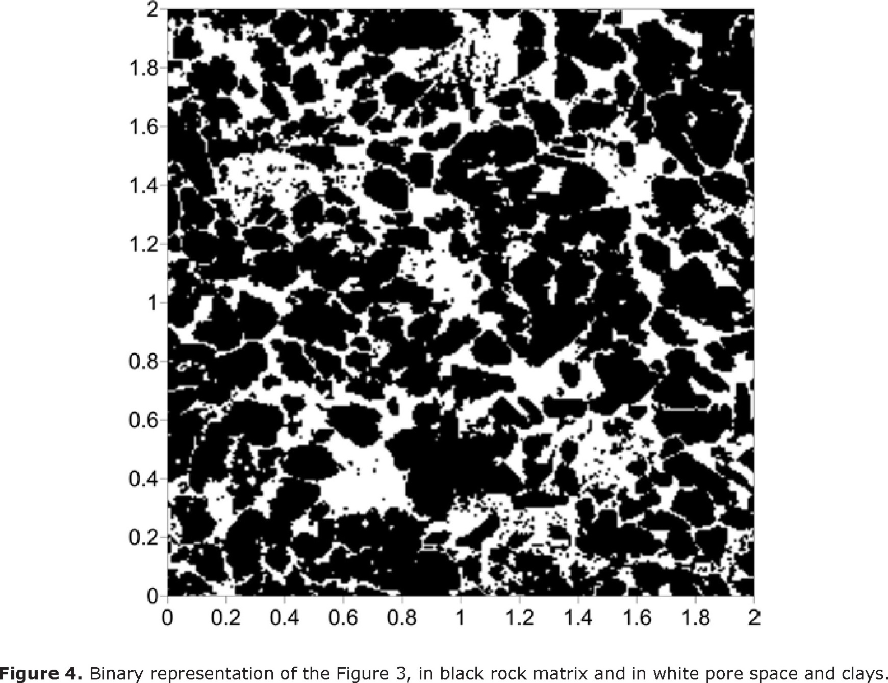 According to the objectives of this work, the reference image was initially segmented in three categories: pore space, clays and rock matrix; the last one grouped in single category: quartz, heavy minerals and feldspars (Figure 3). The resulting image has the same size as the reference image and will help us compare the simulations obtained in the latter stages of the modeling procedure. For the case 1, the reference image is segmented in two categories: black and white; where in black is represented rock matrix and in white are combined pore space and clays (Figure 4). For the case 2 is, it is applied the same procedure, but now in black are grouped rock matrix and clays while pore space is represented in white (Figure 5).