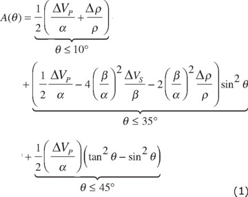 where ρ is average density, and α and β are P and S wave average velocities, ΔVS, ΔVP and Δρ are velocity and density changes from one media to another, θ is the reflection angle and A is the amplitude of the reflected wave. For θ lesser than 35° the equation 1 is approximated to