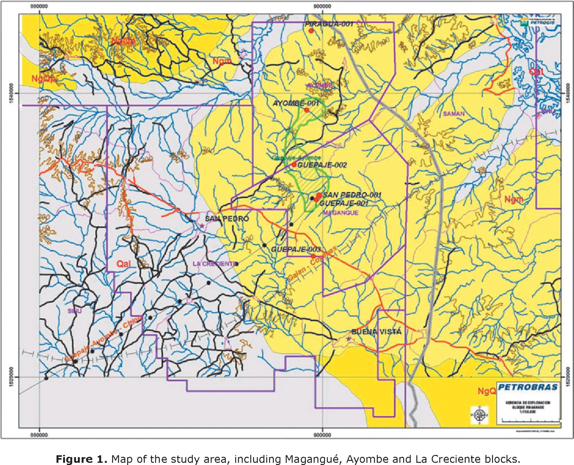 The seismic dataset covers an area of 112 km2, of which, 64 km2 are located in the Magangué block, 41 km2 in the Ayombe block and 7 km2 in La Creciente block. In 1992 gas was discovered in the FCO in the Güepajé-1 well and some gas samples were reported in the Middle Porquero and in the Lower Porquero formations. By the end of 1992 the Ayombe-1 well, drilled at a distance of 6.5 km north of the Güepajé-1 well, reported gas in the FCO (Sánchez, 1993).
