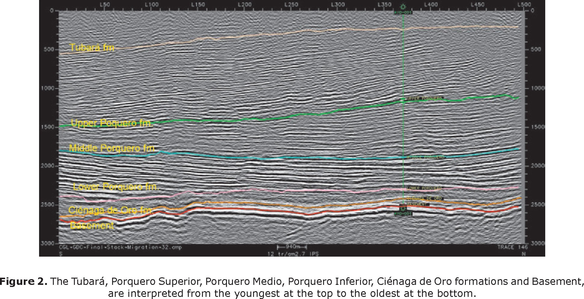 The tops of the Tubará, Upper and Lower Porquero, Ciénaga de Oro formations and also Basement were interpreted in the migrated sections; such events were tied up with the Ayombe-1 well check shot, as seen in the Figure 2.