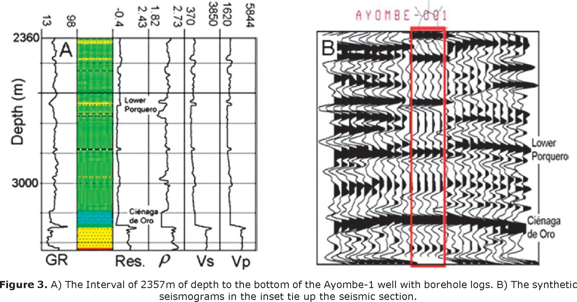 To match the seismic volume along the well, a synthetic seismogram was obtained by the convolution of a wavelet extracted from the seismic volume with the product of multiplying Sonic by Density logs, after depth to time conversion. The Figure 3B depicts the stack section in the vicinity of the Ayombe-1 well along the 2100 - 2500m interval. It is observed how the seismogram ties the Ciénaga de Oro, the Lower Porquero and part of the Upper Porquero formations.