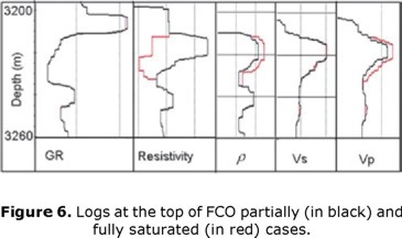 In the 100% water saturation case, when water fills up pores in rock matrix at the top of FCO, the following was observed. The Gamma Ray log remains unchanged because its response does not depend on fluids in pores. The Resistivity log falls quickly due to the gas is more resistive than water. The Density log increases because water is denser than gas. The shear velocity remains the same because liquids cannot be sheared, whereas acoustic wave velocity increases due to the fact that liquids are not compressible.