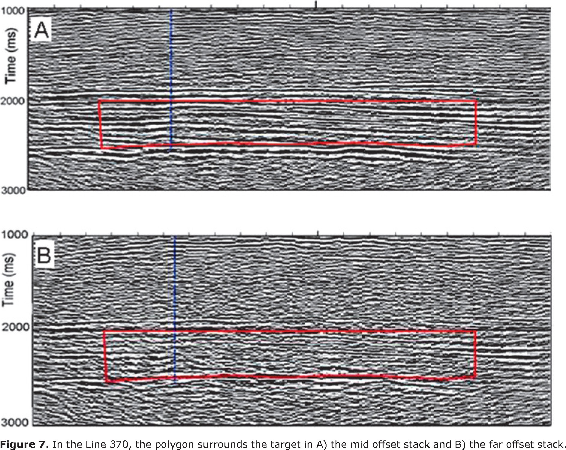 The partial stacks of near offsets (0°-10° range angle), mid offsets (10°20°) and far offsets (20°-37°) were initially generated. Although, the near offset stack was not considered in this analysis because of the very low signal to noise ratio. The obtained partial stacks together with stacking velocities were used to calculate the Gradient (Figure 7A) and the Intercept (Figure 7B) sections.