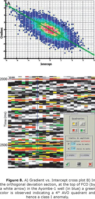 AVO analysis was applied to localize hydrocarbon reserves and to diminish the risk of exploratory projects. Although the number of successful wells increased, dry wells with this type of anomalies were still reported. Ostrander (1984) published a method applied to prestack sections to discern anomalies caused by sandstones with or without gas. Rutherford and Williams (1989) characterized three different seismic anomalies produced by hydrocarbons (class I, phase change class II, and bright spot class III). AVO analysis gained a new impulse with the contributions of Hilterman (1975) and Smith and Gidlow (1987), who established the concepts of Intercept and Gradient, and introduced the analysis of Intercept and Gradient images separately. In the linear relationship between seismic amplitudes and squared sine of reflecting angles, the Gradient represents the slope and the Intercept the reflecting coefficient. Rutherford and Williams (1989) and Castagna (1997), proposed classifying AVO anomalies in four classes according to Intercept and Gradient values. Rosa et al. (1999) introduced the Elastic Impedance concept, based on using volumes partially stacked by range of angles together with the visualization and analysis of images of Gradients and Intercept, (Connolly, 1999).