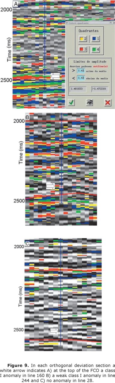 In order to restrict the analysis at the top of the FCO, only those data inside the boxes of figures 7A and 7B were correlated. As a result, the obtained cross correlation graph was inserted in Figure 8A. Using the same straight line that established the background at the top of the FCO, an orthogonal deviation section was generated, Figure 8B. At the top of the FCO in the vicinity of Ayombe-1 well a green color and a tiny red color are observed (indicated by an arrow), which according buttons at right of Figure 8B indicates IV to III quadrant and hence a weakly class II to a class I anomaly. This result agrees with the result obtained by previous well modeling. This partial stack AVO methodology was applied to seismic traces belonging to three 2D seismic lines that crossed or were very close to the three wells Güepajé-1 (line 160), the Güepajé-2 (line 244) and the Güepajé-3 (line 28). Consequently, the three deviation sections associated to the mentioned lines were obtained, focusing on target zones in vicinities of the three considered wells. The analysis of the deviation sections of the line 160 at top of FCO in Güepajé-1 well (indicated by an arrow) identified III to IV quadrant pointing out a class II to a class I anomaly (Figure 9A). In the deviation section of the line 244 at the top of the FCO in Güepajé-2 well (marked with an arrow) no anomaly was identified Figure 9B. Finally an incipient class I anomaly was detected in the deviation section of the line 28 in the Güepajé-3 well, see the arrow in Figure 9C. Up to this point, the partial stack AVO methodology has been applied to 2D seismic data and after having verified its robustness with well logs, the technique was used on 3D seismic volume to detect anomalies associated to gas over the surface defining the top of the FCO.