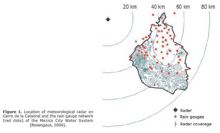 Since 1995 a network of 13 C-band Doppler meteorological radar equipment exists in Mexico (Valdés-Manzanilla and Aparicio, 1997). Their main objectives are to monitor the tropical cyclones in or near the Mexican national territory and to estimate rainfall with hydrological purposes. One of these radar stations is near the metropolitan area of Mexico City, at the top of Cerro de la Catedral. Also, a network of digital rain gauges with telemetry, owned by the government of Mexico City, covers much of the city area.