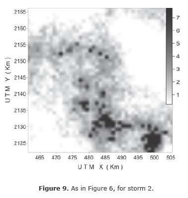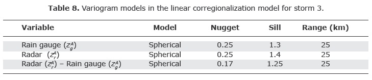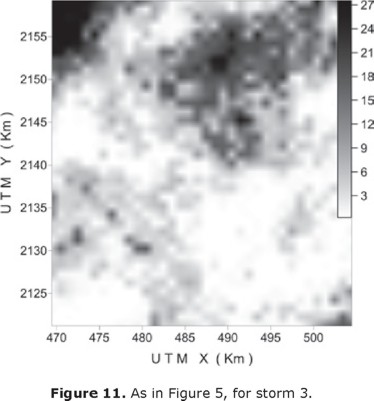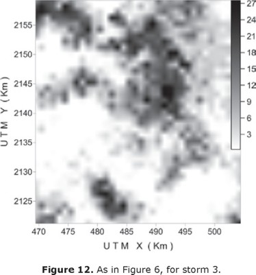 For the simulation of storm 1 (Figure 5) rain gauge data and the model shown in the first line of Table 4 were used. For the cosimulation of this storm (Figure 6) rain gauge and radar data of the corresponding storm and the model showed in Table 2 were used. The simulation of storm 2 (Figure 8) was done using rain gauge data and the model in the third line of Table 4; for the cosimulation (Figure 9) the rain gauges and radar data of storm 2 and the model shown in Table 7 were used. For storm 3, as in the previous two cases, the univariate simulation (Figure 11) only uses rain gauge data and a model (fifth line, Table 4) and the cosimulation (Figure 12) was done with all the information available and amodel (Table 8).