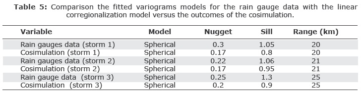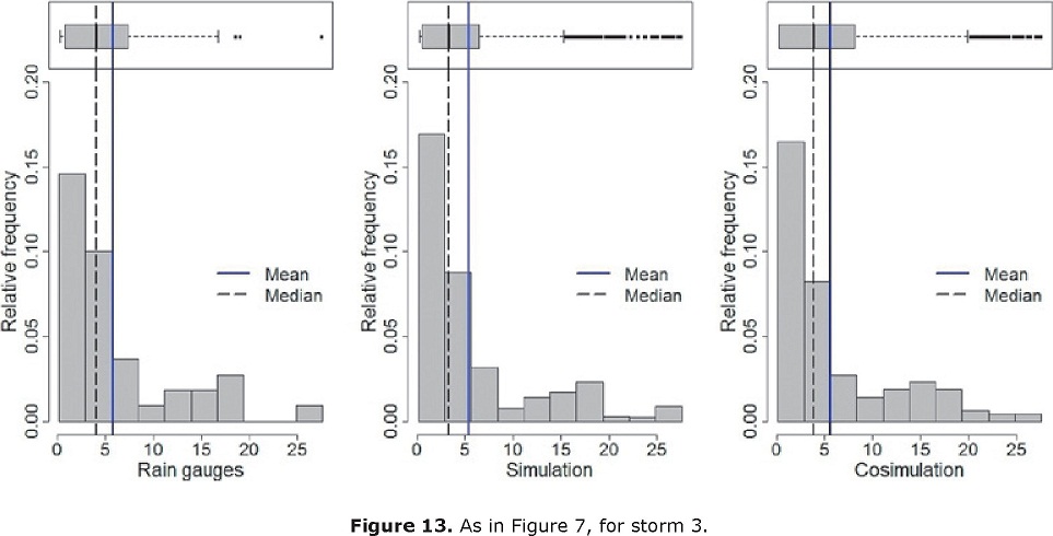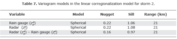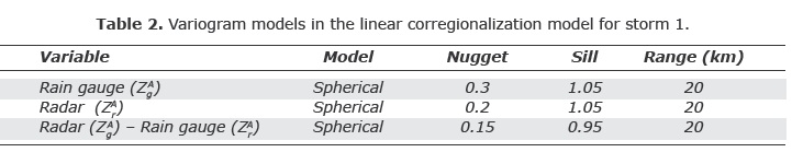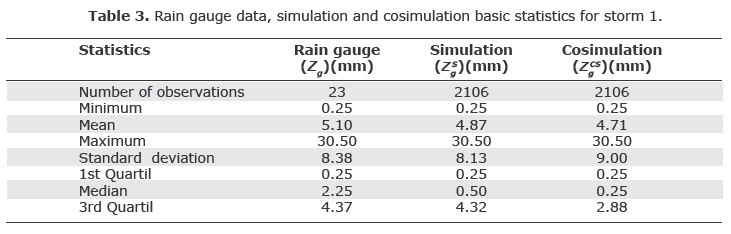 When there is enough information to accurately estimate the variogram (Storm 2), simulations using only rain gauge data generated consistent estimations with the variability and the spatial distribution of the rainfall, but cosimulations with rain gauge data and radar images generated more precise and detailed estimations of the spatial distribution.