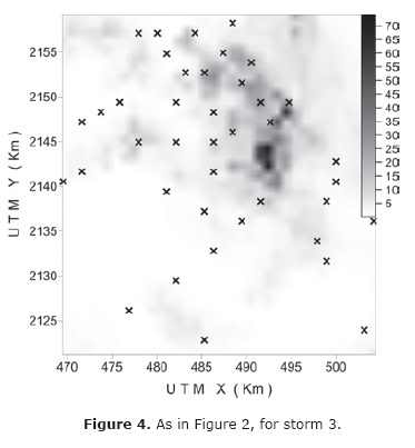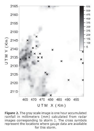 Rain gauges Zg (Table 1) and radar images Zr (Figure 2, Figure 3, Figure 4) were recorded in Mexico City during 13, 15 and 16 July 1997 (referred thereafter as storm 1, 2 and 3). Storm 2 has the largest number of gauge data (50), while storm 1 has only23gaugemeasurements.On Figure 2, Figure 3 and Figure 4 the gray scale images correspond to one hour accumulated precipitation given in millimeters (mm), while the cross symbols represent the locations of gauge data for this storm.