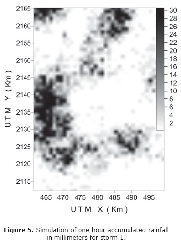 For all storms, simulations estimate adequately precipitation. Comparison of radar images with simulations is complex because radar images are not taken at ground level. In radar images the precipitation falls in a small region and is greater than those recorded by rain gauges and from simulations, this may be due to evaporation of rainfall before it reaches the ground, because of high elevation of the radar beam over the valley of Mexico (Zawadzki,1984).