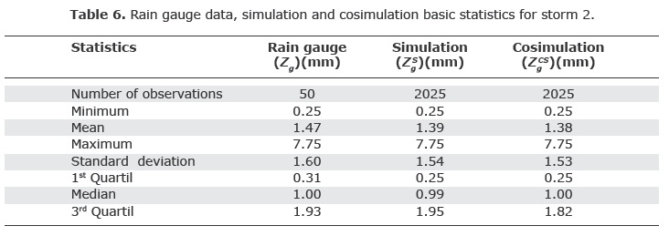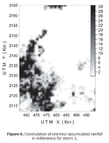 Results for each storm were compared with the corresponding sample information. The Figure 6. Cosimulation of one hour accumulated rainfall in millimeters for storm 1. simulations reproduce adequately the statistical values (Table 3, Table 6 and Table 9), the histograms and box plots (Figure 7, Figure 10 and Figure 13), as the variogram model of the data (Table 4 and Table 5).