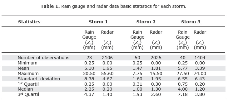 The sequential Gaussian method was applied using the rain gauge data and radar data. During the exploratory data analysis, several statistical parameters were computed (Table 1) and histogram graphics were generated. It was found that the data do not have normality; consequently, an anamorphosis transformation was applied to them, which ensured normality in the transformed data (Chilès and Delfiner, 1999).