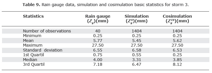 Here, two simulations for each storm: a univariate simulation (ZS) using only rain gauge data and a cosimulation (ZCS) using rain gauge data and radar images are performed. To evaluate the results, their statistics were satisfactorily compared with those of the data.